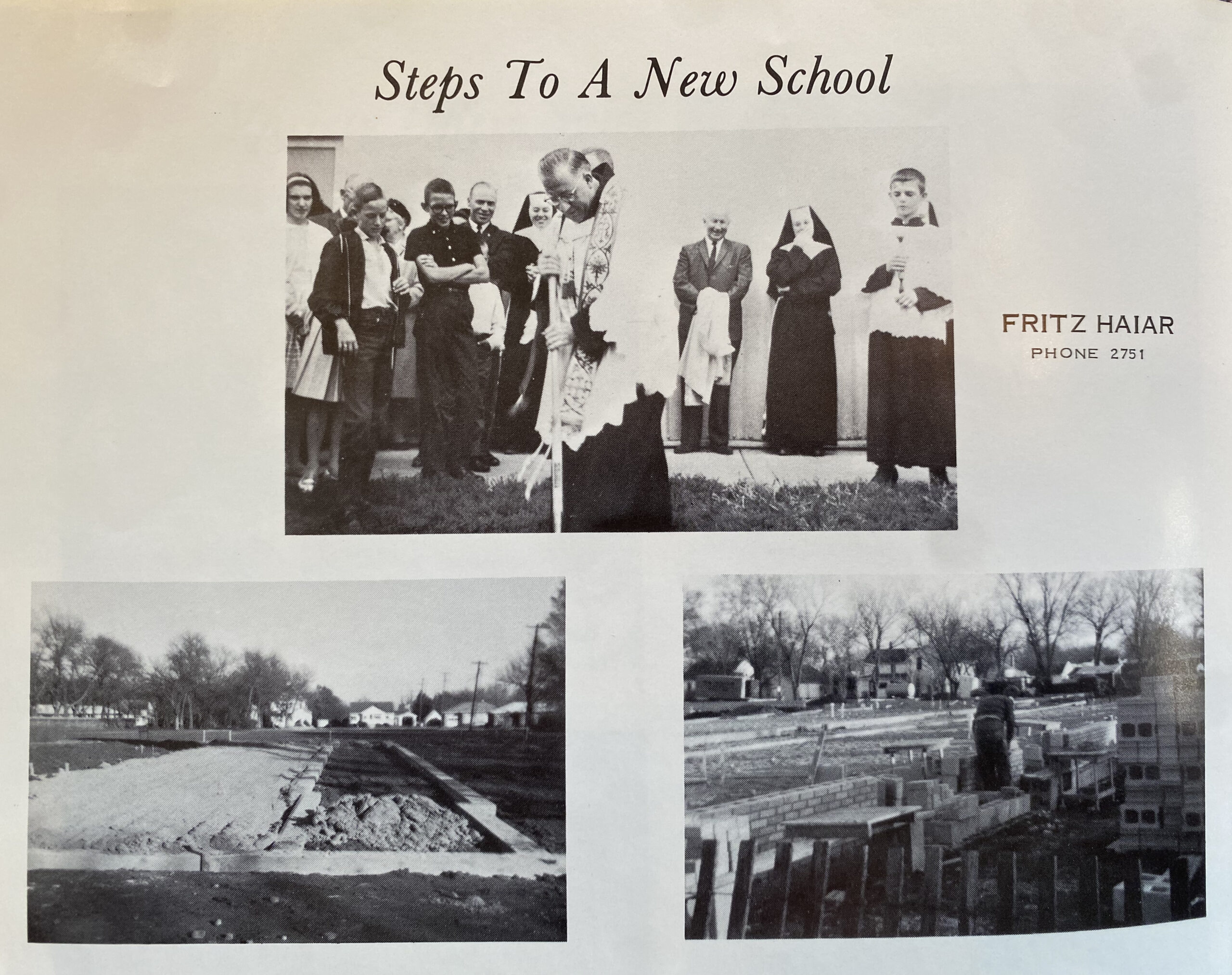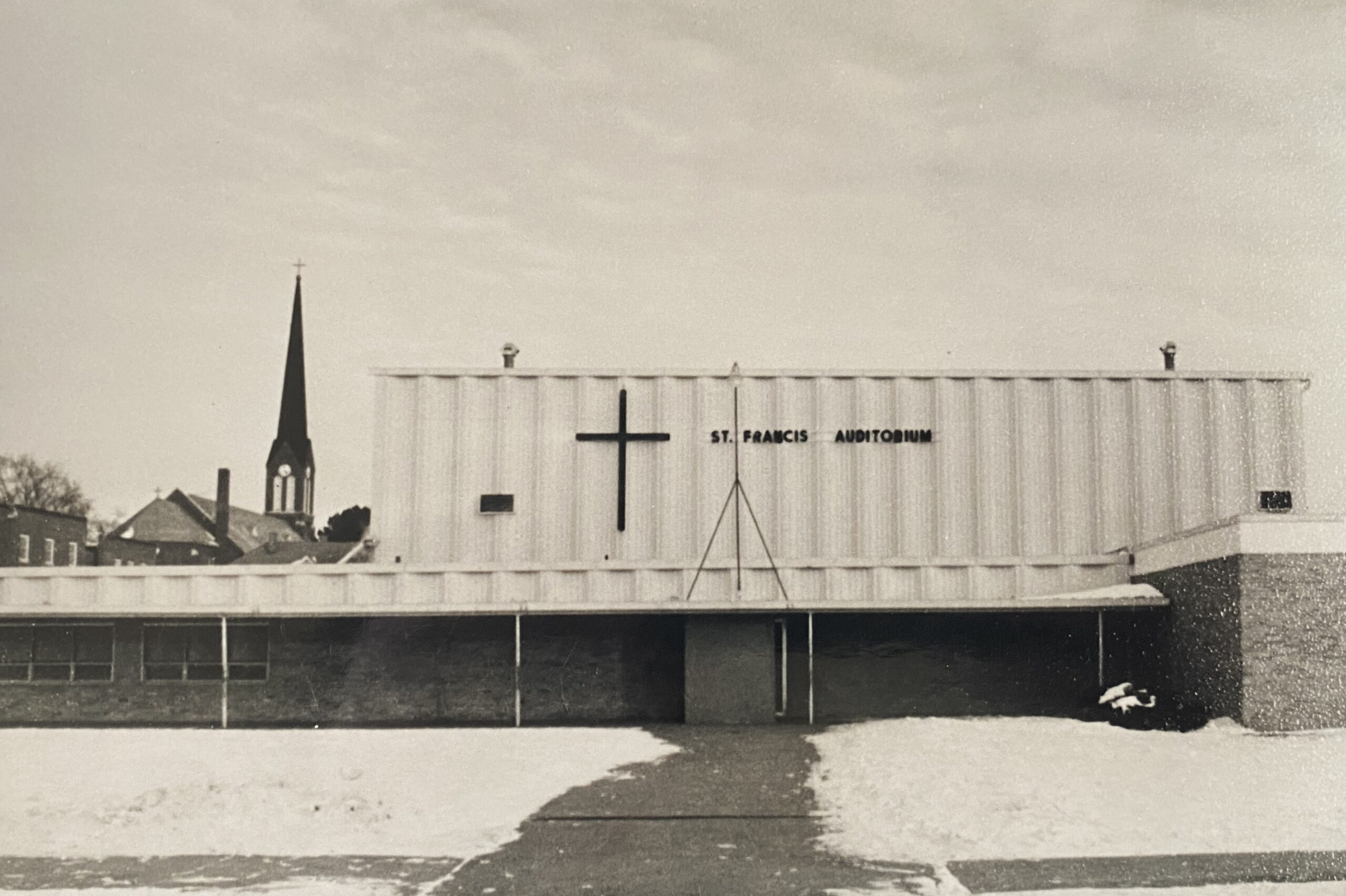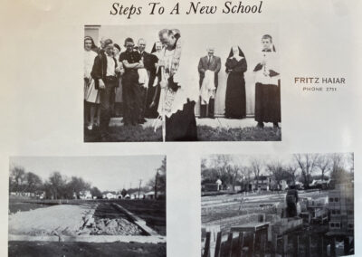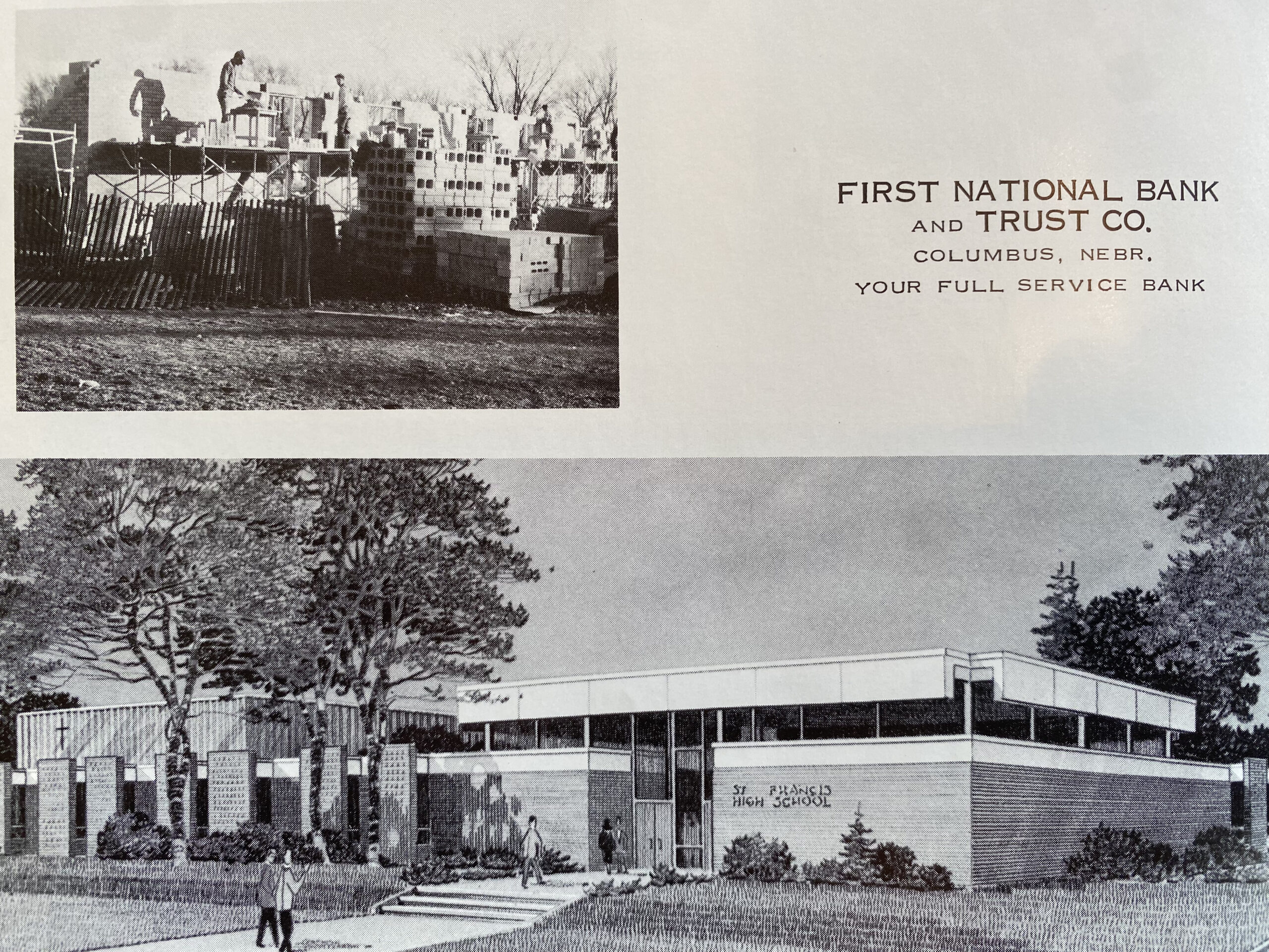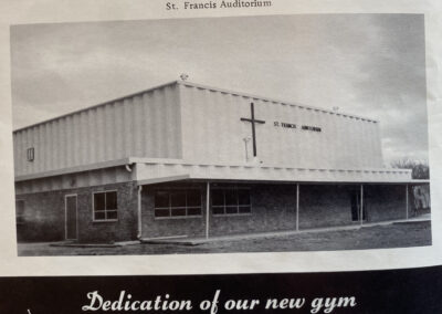 In October of 1961 St. Francis Auditorium was completed and dedicated by Archbishop Gerald T. Bergan. In 1966, the new high school was built, attached to the auditorium, and classes were moved from the Sisters’ Convent. Students from five parishes fed into the K-12 school and enrollment was 624. The convent space was converted from semi-dormitory into private rooms for the Sisters in February of 1968. In appreciation, the Sisters consented to allow the high school to establish a manual arts course in the basement of the convent. (more pictures in the gallery below)